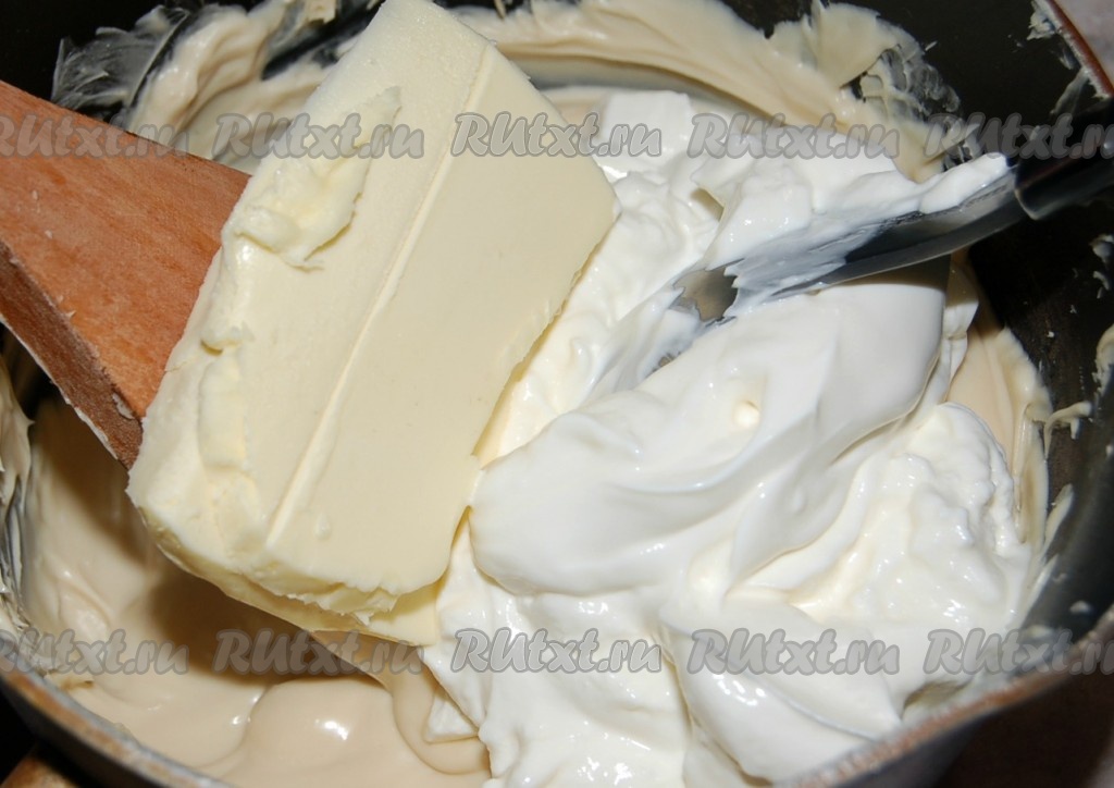Затем добавить к растопленному шоколаду сливки и сливочное масло.