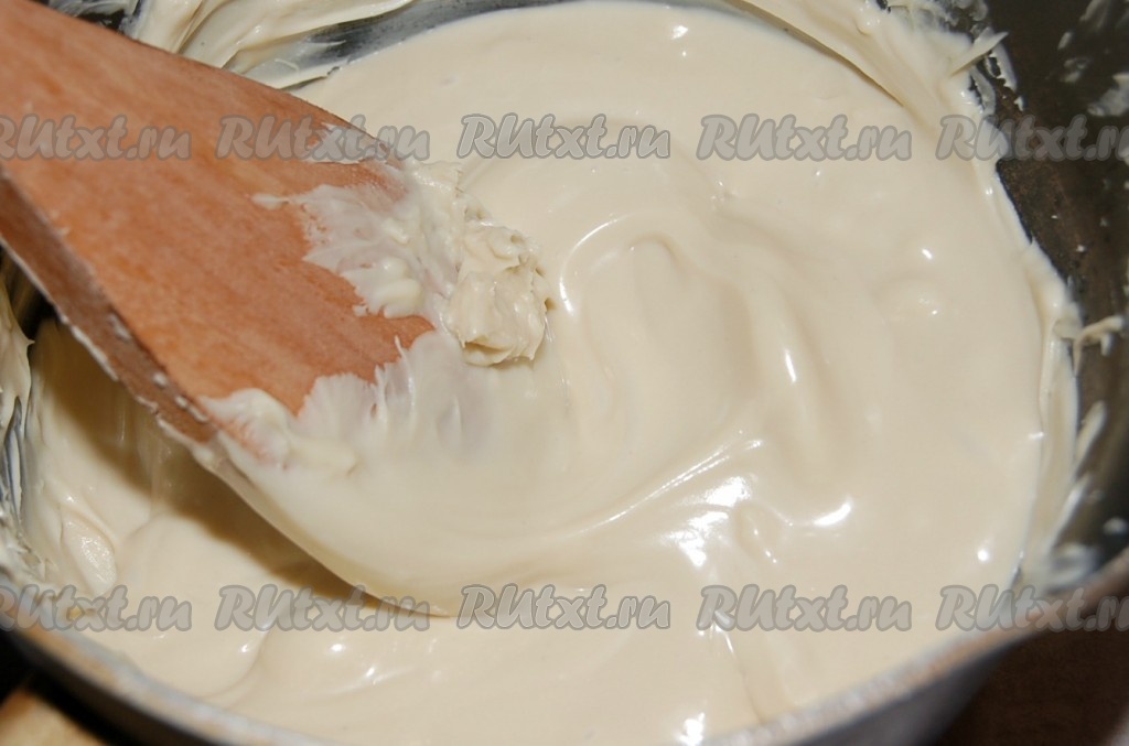 Пока песочный пирог остывает, нужно сделать сладкую начинку. Для этого в небольшой ковшик поломать белый шоколад и на водяной бане растопить его.