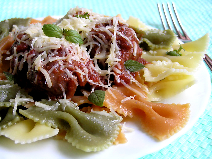 Фарфалле - это макаронные изделия в виде бабочек. В Италии их часто готовят на семейные воскресные обеды и выкладывают в центр стола на большой тарелке. Если Вы неравнодушны к итальянской кухне, предлагаю попробовать эти праздничные трехцветные фарфалле с нежными и ароматными фрикадельками, а листики мяты освежат блюдо и напомнят о приближающейся весне. Угощайтесь!