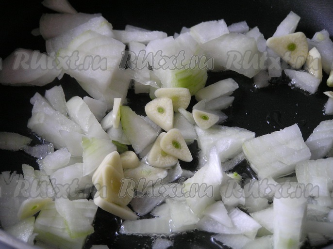 Разогреть в сковороде оливковое масло и обжарить нарезанные лук и чеснок до мягкости,