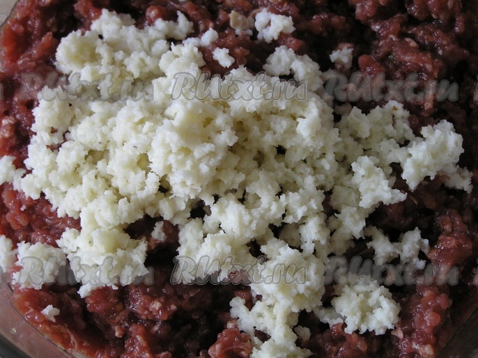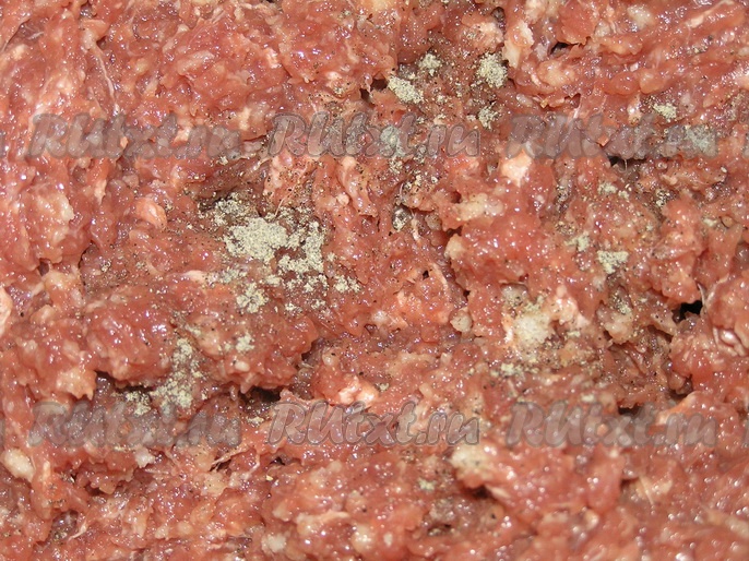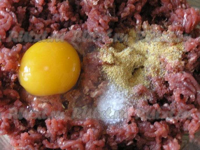 Фарш смешать с яйцом, солью и сушеным чесноком.