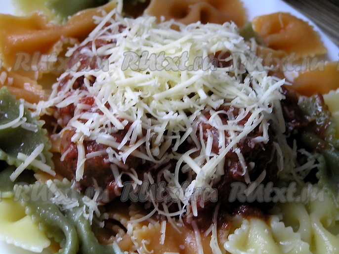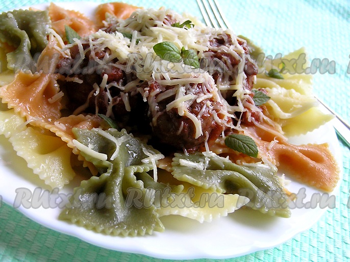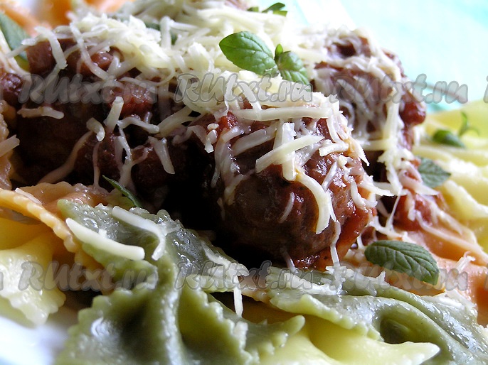 Готовую пасту можно сразу смешать с фрикадельками в соусе (так как раз и делают итальянцы), а можно разложить пасту по тарелкам и сверху выложить фрикадельки, что я и сделала.