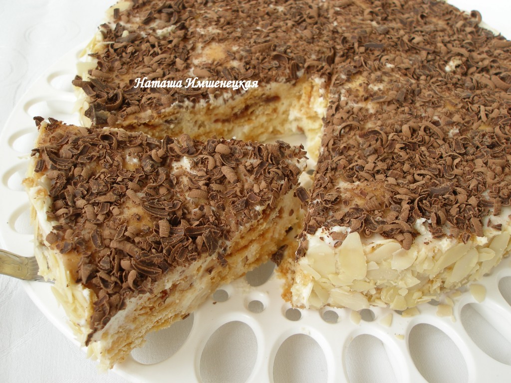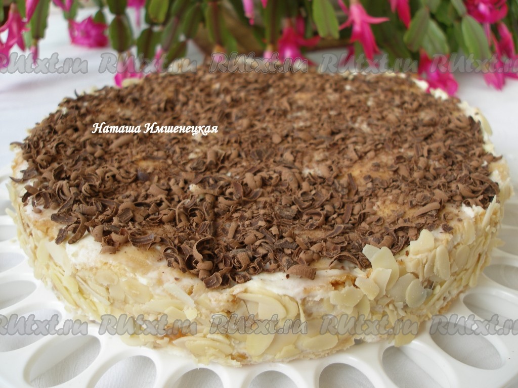 Аккуратно достать торт из формы. Украсить "Трухлявый пень" по своему желанию и умению. Я украсила бока торта пластинками миндаля, а верх - тёртым шоколадом.