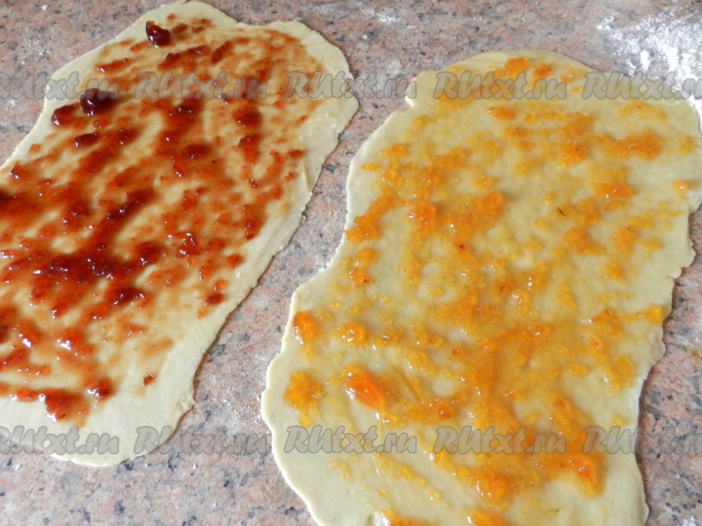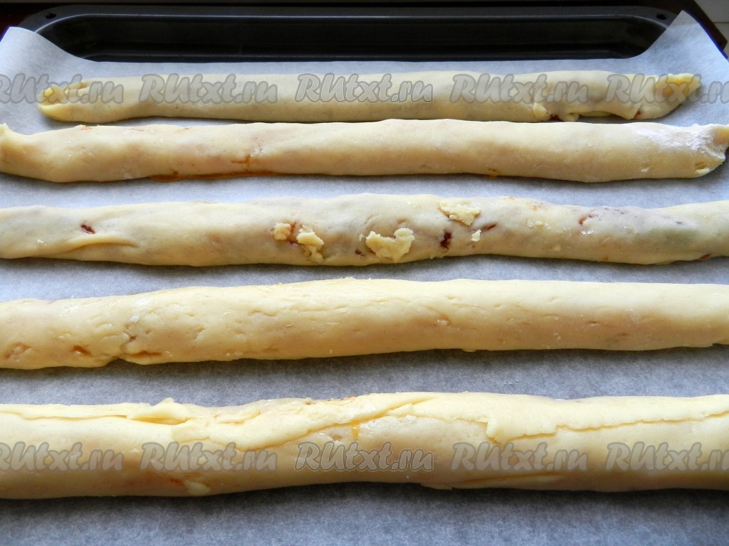 Свернуть каждую часть теста в рулет и выложить на противень, застеленный бумагой. Рулеты нужно выкладывать на расстоянии друг от друга, так как они увеличатся в процессе выпечки.
