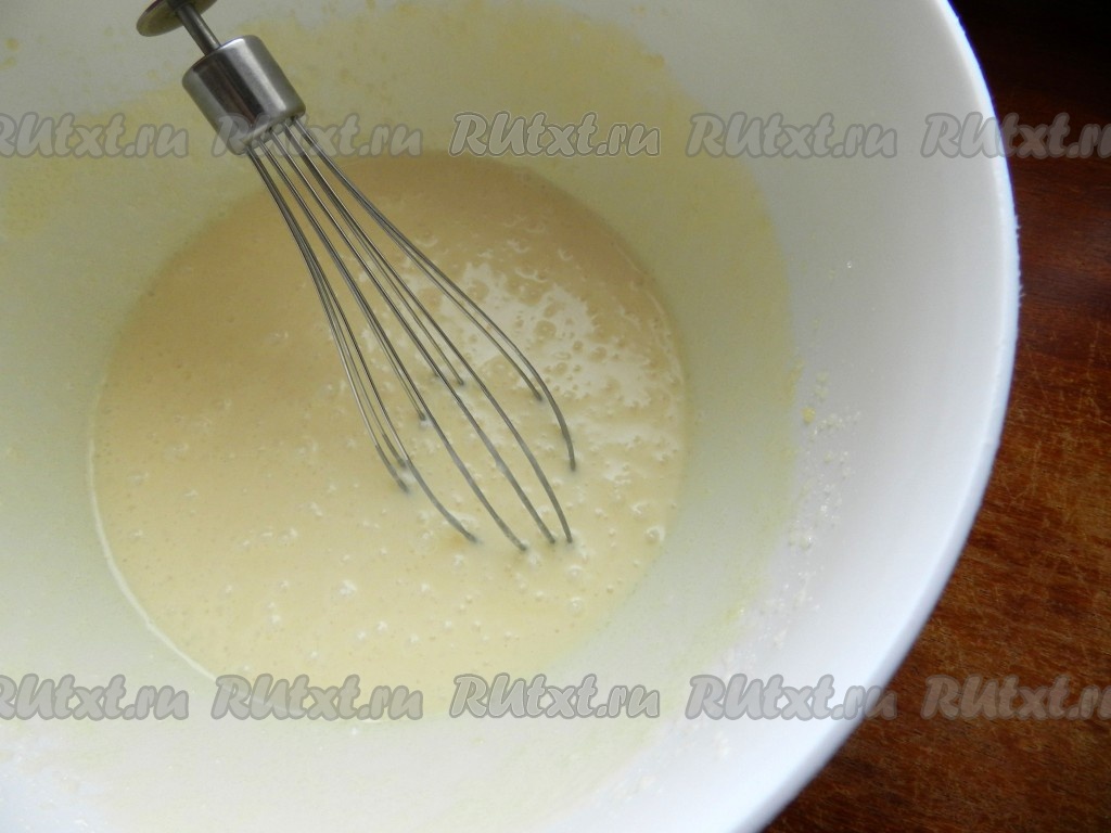 Яйцо взбить с сахаром с помощью венчика, затем добавить растопленное сливочное масло и сметану, снова взбить венчиком. Должна получиться однородная масса.