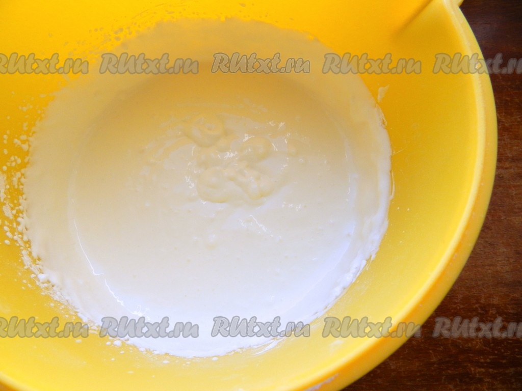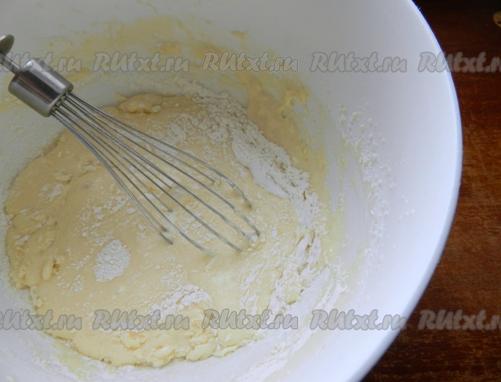 Постепенно всыпать муку с разрыхлителем, замешивая тесто вначале венчиком.