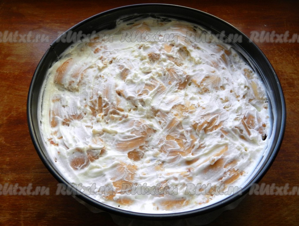 Разъёмную форму для выпечки (или другую) застелить бумагой. Каждый кусочек рулета макать в сметанный крем и плотно укладывать в форму в произвольном порядке. Таким образом сделать два слоя.