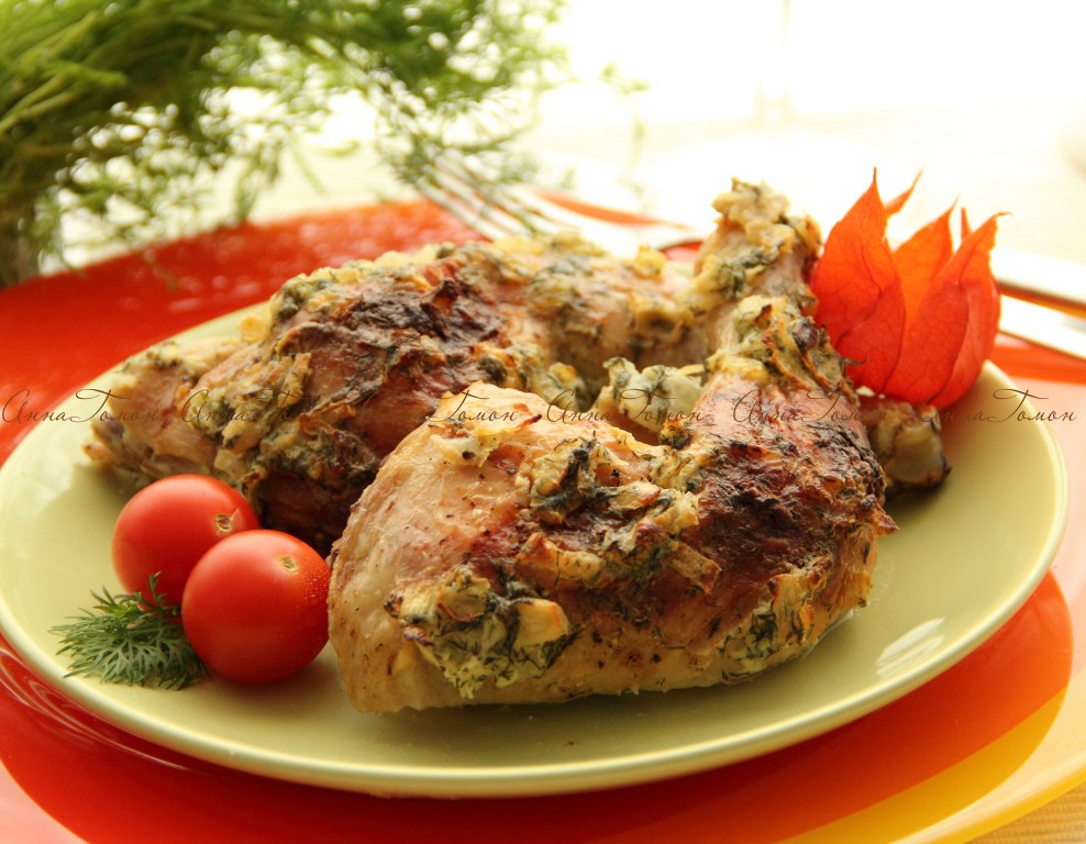 5. Влить сливочный соус в форму с цыпленком и запекать еще 15 минут.
