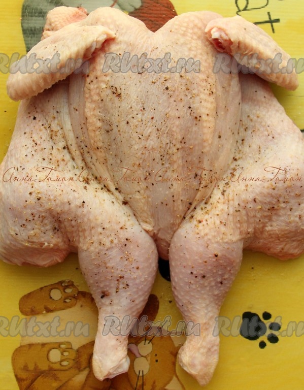 1. Цыпленка вымыть, обсушить. Разрезать тушку по позвоночнику, перевернуть и надавить на грудину. Извините за негуманное фото.