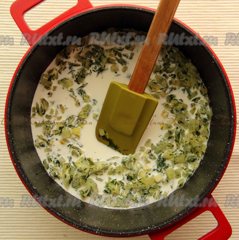 4. Разогреть в сотейнике оливковое масло, добавить лук, укроп и лимонную цедру. Обжарить на небольшом огне. Влить сливки, перемешать и готовить около 5 минут до загустения.