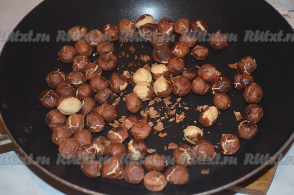 Сливочное масло достать из холодильника, чтобы оно согрелось и стало достаточно мягким. Орехи обжарить на сухой сковороде, помешивая, в течение 5-7 минут. Дать орехам немного остыть, очистить от шелухи.