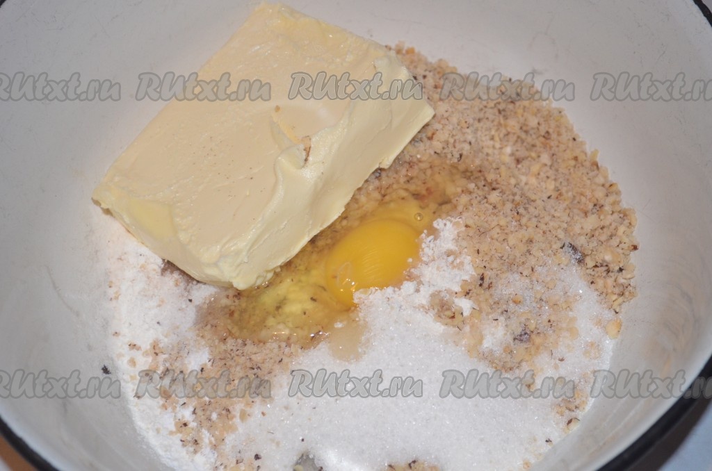 В миске соединить мягкое сливочное масло, муку, сахар, измельчённые орехи, яйцо, разрыхлитель, корицу и ванильный сахар.