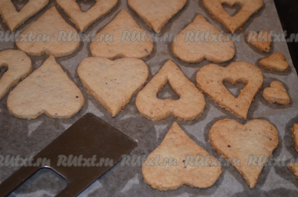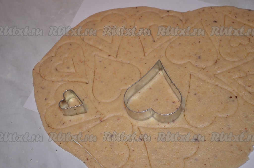 Затем тесто тонко раскатать на присыпанной мукой поверхности (мне удобно раскатывать тесто между двух листов пергаментной бумаги). Печенью можно придать любую форму, я взяла формочки в виде сердечек. Вырезать парные фигуры формочками для печенья, в одной из фигурок прорезая "окошко" (как на фото).