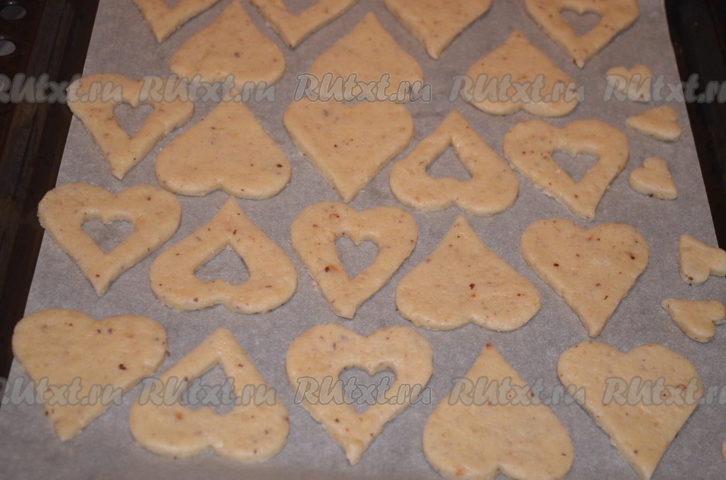 Выложить заготовки орехово-песочного печенья на противень, застеленный пергаментом (печенье удобно перекладывать на противень лопаткой). Убрать противень в холод на 30-40 минут, так печенье лучше сохранит свою форму при выпечке.