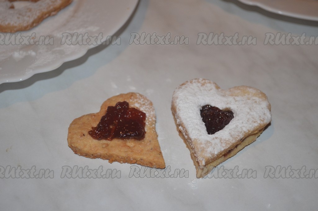 Другую часть печенья смазать джемом, оставляя свободными края. Сложить 2 половинки печенья вместе.