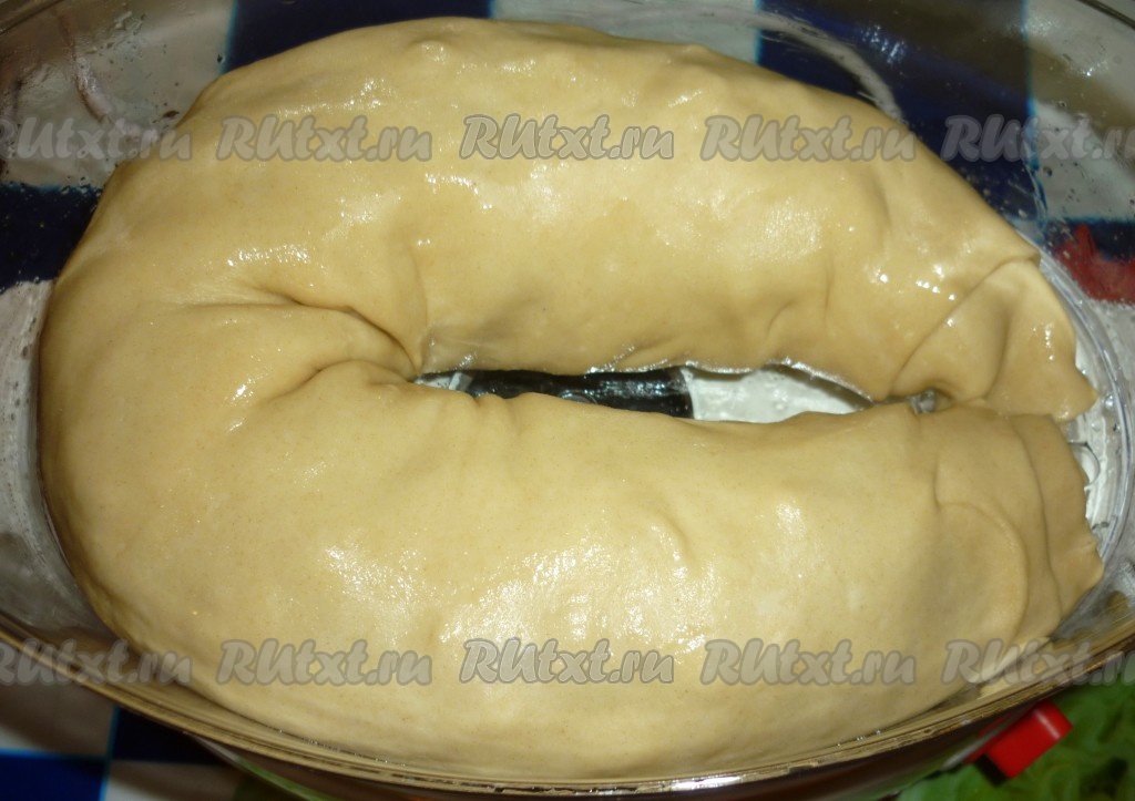 Жидкие ингредиенты соединить с мукой и замесить  эластичное тесто, вымешивать минут 7-10.