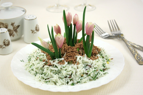 Выложите салат на блюдо. Бока салата украсьте натертым белком, смешанным с укропом. А сверху салат посыпьте натертой печенью, делая «проталинку».