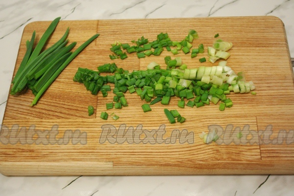 Зелёный лук помойте, обсушите и нарежьте. Оставьте зеленые кончики лука для украшения салата.
