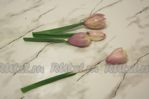 Каждый цветочек посадите на зубочистку, а зубочистку спрячьте под зеленый лук.