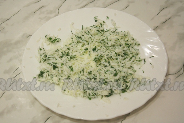 Оставшиеся белки потрите на мелкую терку. Укроп мелко нарежьте.
