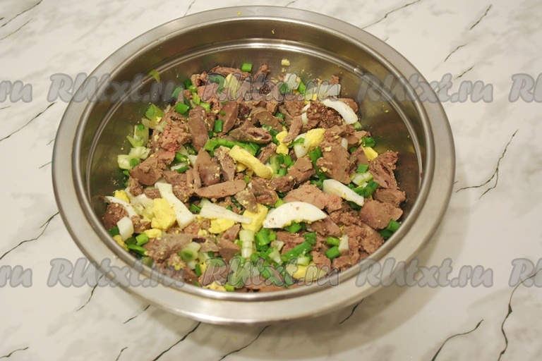 Смешайте куриную печень, сердечки, яйца и зеленый лук. Посолите салат по вкусу.