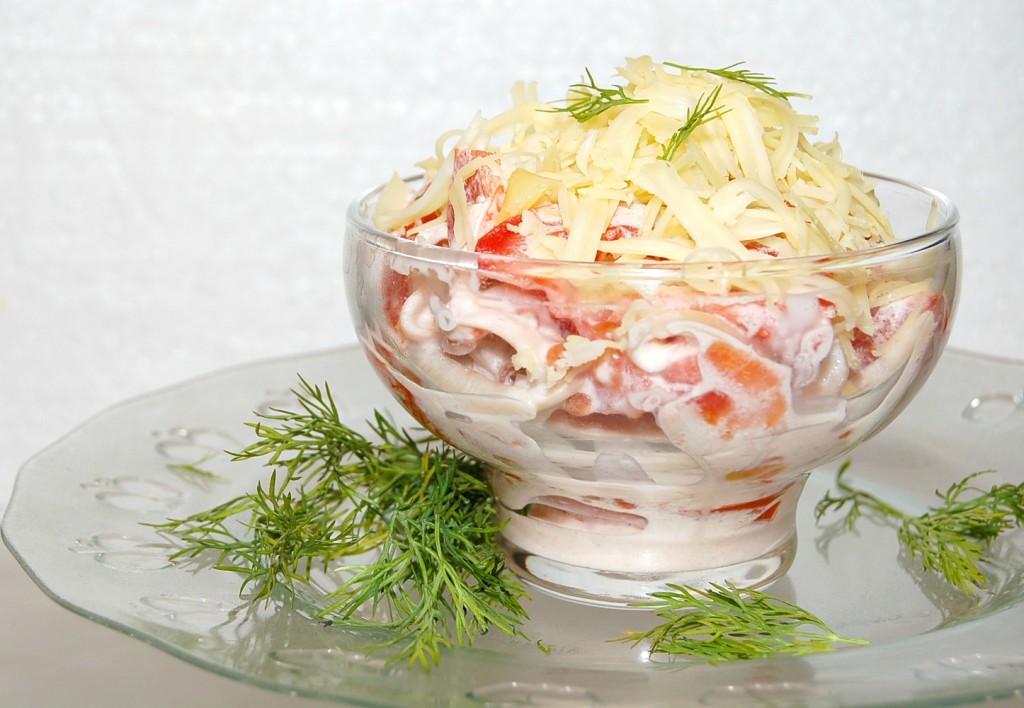 Салат "Красное море" содержит в своем составе отварные кальмары, свежие помидоры, чеснок и в качестве заправки используется смесь майонеза со сметаной. Нужно отметить прекрасное сочетание кальмаров с помидорами. Чеснок добавляет салату "Красное море" определенную нотку пикантности. Майонез придает заправке необходимую остроту, а сметана - определенную нежность. Салат отличается свежестью и пикантностью, он вполне впишется в праздничное меню, а также выполнит роль вкусной закуски в домашнем обеде.
