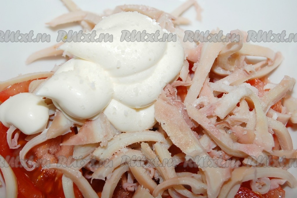 Сначала нужно подготовить кальмаров. Если у вас мороженные кальмары, их нужно разморозить, затем опустить на 1-2 минуты в горячую воду. Потом промыть под проточной холодной водой, очищая от пленок и хорды. Поставить кастрюлю с водой на огонь, добавить в воду соль, перец горошком. Как вода закипит, опускать в нее кальмары по одному, дождаться, когда вода вновь закипит, досчитать до 10 и с помощью шумовки вытащить готового кальмара из кастрюли. И так проделать по очереди со всеми кальмарами. Варить их по одному! Тогда кальмары будут мягкие и нежные, сохранят свой размер.