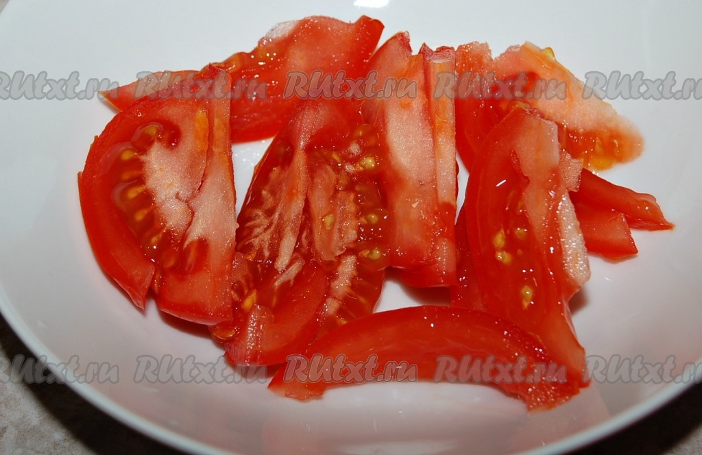 Пока кальмары остывают, нарезать помидоры ломтиками и уложить их в миску.