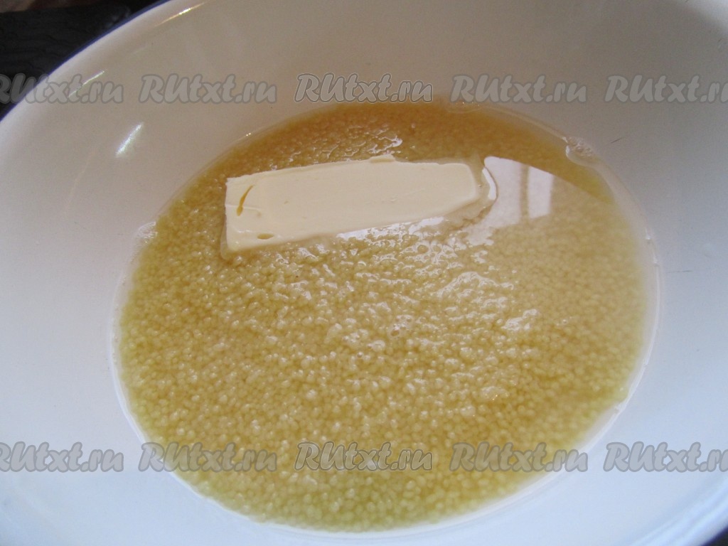 Вскипятить воду (1 к 1) и залить кус кус, добавить кусочек масла, соль и накрыть на 5 минут настояться.
