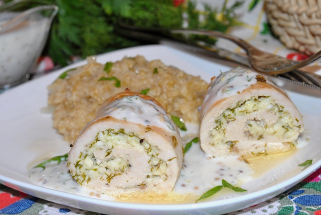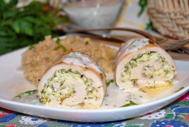 Готовые аппетитные, сочные куриные рулетики, приготовленные с творогом, достать из духовки и тёплыми подать к столу, дополнив соусом и гарниром.
