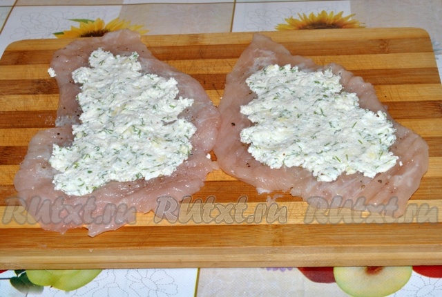 На каждый подготовленный кусок филе выложить четверть начинки из творога и зелени, немного отступая от краёв мяса.
