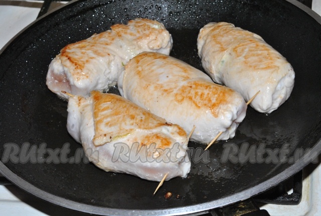 На сковороде разогреть растительное масло. Затем выложить 4 сформированных куриных рулетика с творожной начинкой, обжарить их на среднем огне с двух сторон до лёгкой золотистой корочки.