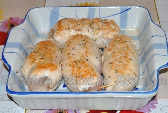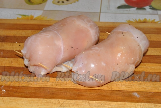 Начиная с более узкой стороны, свернуть каждое куриное филе с творогом и зеленью в рулетик. При необходимости можно зафиксировать края рулетиков зубочистками.