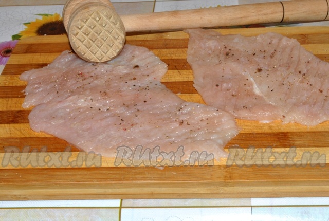 Сливочное масло должно быть комнатной температуры, поэтому его нужно заранее достать из холодильника. Филе курицы вымыть, обсушить. Разрезать каждое филе вдоль пополам. Каждый кусочек мяса хорошо отбить кухонным молоточком, но чтобы не было дыр. Мясо слегка посолить, поперчить, оставить отдохнуть на 5-10 минут. Из 2 куриных филе у меня получились 4 отбитых кусочка мяса.