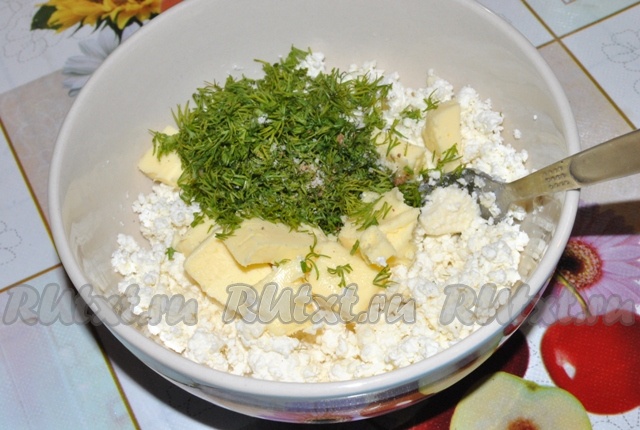 Для приготовления начинки в миску выложить творог, размять вилкой, добавить пропущенный через пресс чеснок, кусочки сливочного масла комнатной температуры, мелко нарезанную зелень, можно немного присолить по вкусу и поперчить.