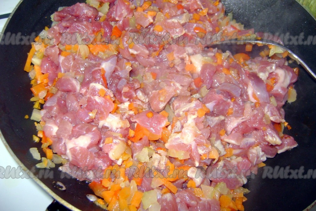 Добавить мясо, перемешать.