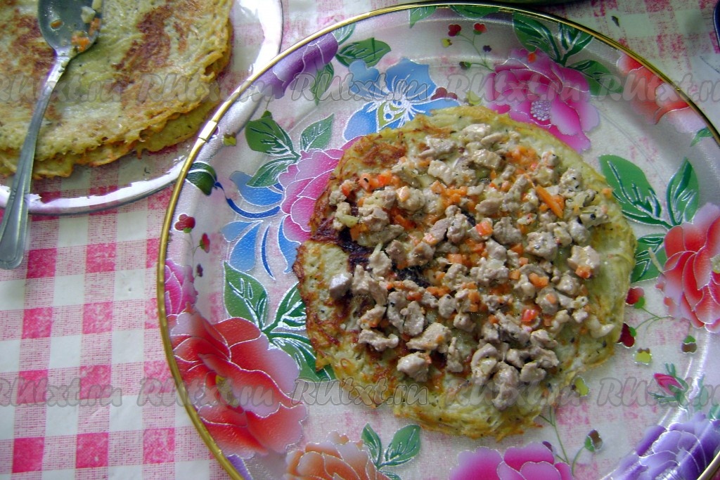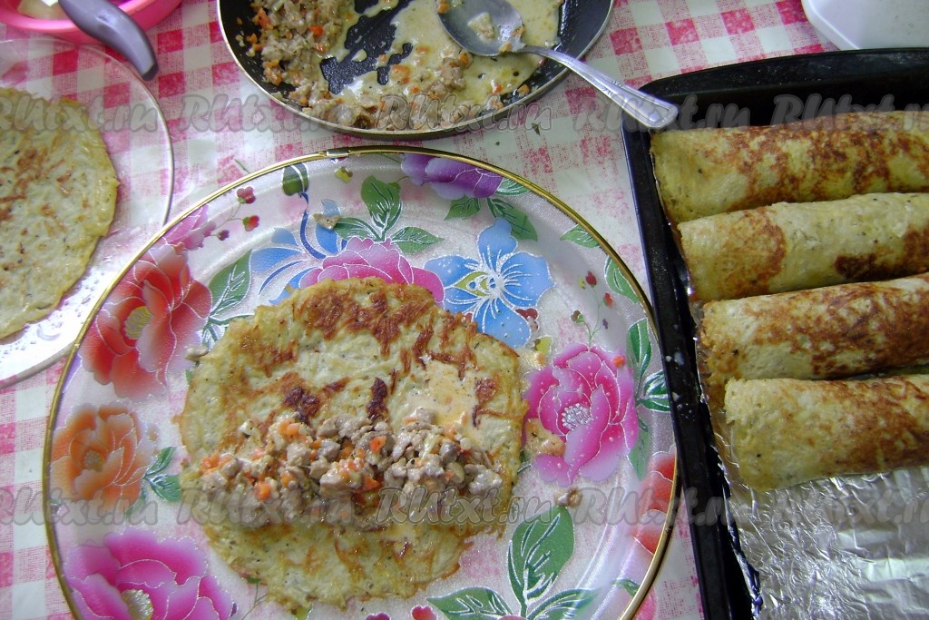 На картофельный драник выложить начинку. Можно выложить начинку по всей лепешке и свернуть рулетик,