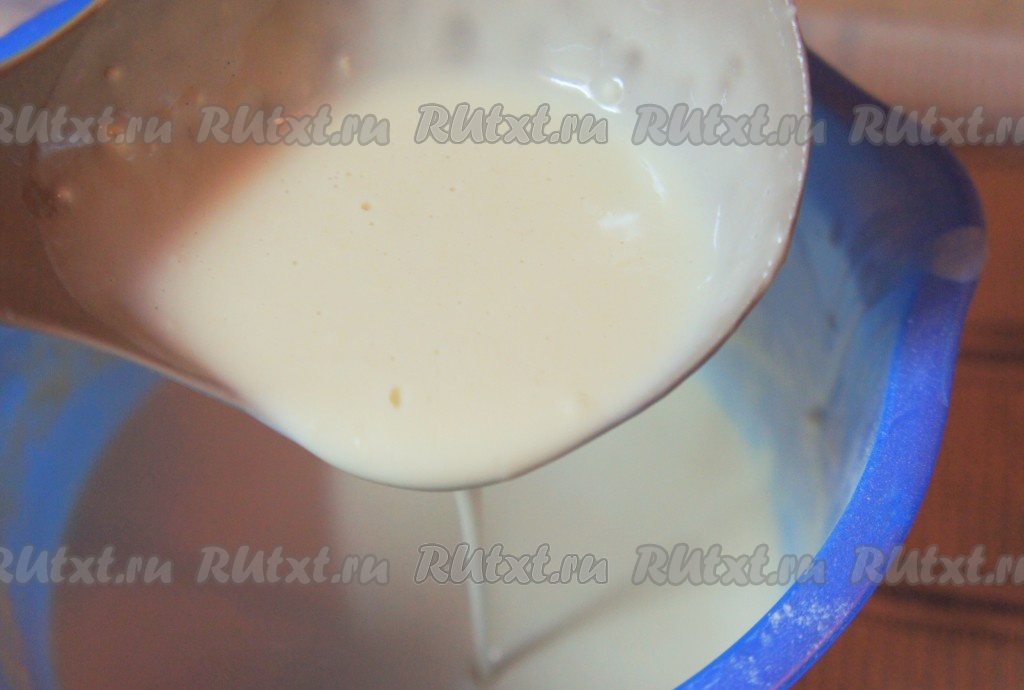 Теперь приготовим блинчики. Как правило, при приготовлении блинчиков из блинной муки используют пропорции 1:1, например, 2 стакана блинной муки к 2-ум стаканам воды или молока и т.д. Муку просеять в глубокую миску, добавить кипячёную воду или молоко комнатной температуры и с помощью венчика тщательно перемешать, чтобы не было комочков, добавить растительное масло и ещё раз перемешать. Тесто готово, оно должно получиться достаточно жидким.