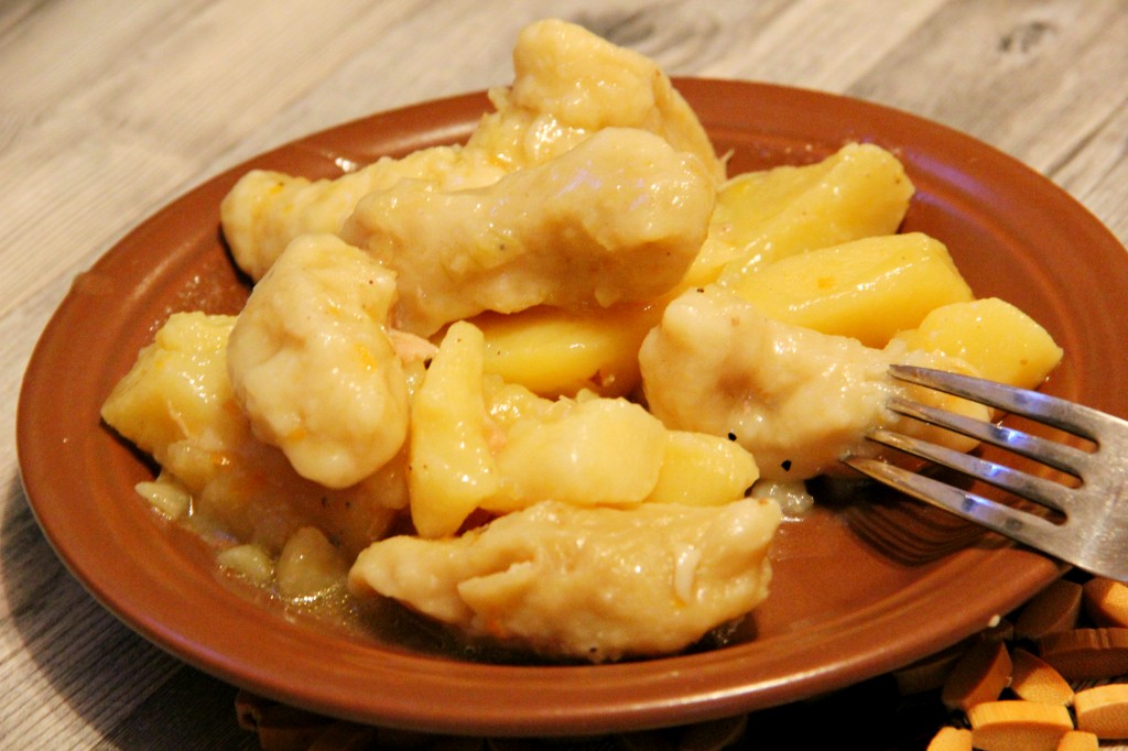 Моя бабушка была спец по кулинарии с рождения. Знала много как старинных, так и на то время современных рецептов. Это блюдо она готовила просто обалденно. У нее картофель и нудли, которые прикасались к стенке казанка, были поджаренными, хрустящими. Она вливала жир в казан, прожаривала лук, морковь, мясо кусочками и картофель. Его она НИКОГДА НЕ КЛАЛА В ВОДУ. Сначала зарумянивала, только потом наливала воду. В готовом блюде не было  жидкости. Вы можете сказать, что оно сухое, никакое. Наоборот, оно очень вкусное. Когда меня бабушка учила его готовить, она говорила: главный секрет в его приготовлении - чтобы он был плотно закрыт. И она намачивала полотенце, очень тщательно обматывала место соединения крышки с казанком, а сверху всегда клала что-то тяжелое. В ее случае -это был кирпич. - Запомни, - говорила она мне, - в казан лей ровно столько воды, сколько кефира ты налила в тесто. Стакан кефира - стакан воды. Три стакана кефира - значит ровно три стакана воды и ни грамма больше!!! Естественно, что на пол казана картошки стакан воды - маловато. Следовательно, и кефира должно быть соответственно. И почему-то она это блюдо называла "шнудли". И они у нее всегда отделялись одна от другой. Штрудли делаются рулетом, а шнудли - нет, говаривала она. Кстати, мой дедушка их готовил не хуже. И мне кажется, что его шнудли были намного вкуснее. Хотя и делал он их также. Может от того, что он мужчина и вкладывал всю душу в приготовление этого блюда? Хотя, бабушка тоже готовила с душой.