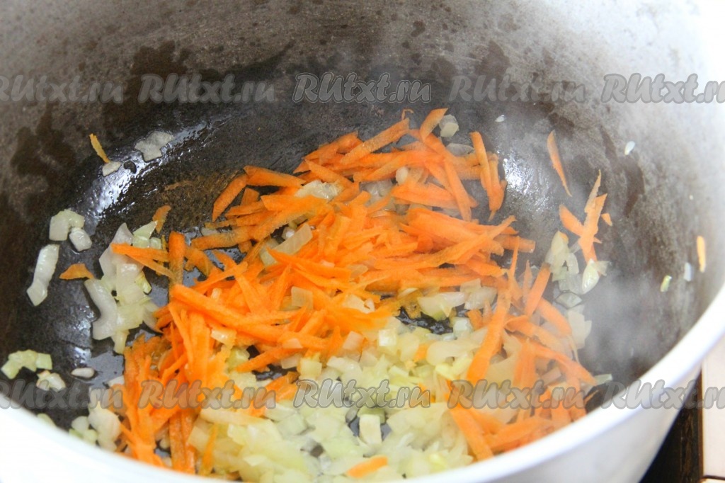 Лук и морковку пассировать на растительном масле до золотистого цвета.