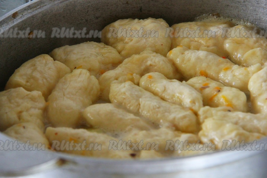 Вообще называются они Штрудли. От немецкого - Штрудель - рулет. У нас бабушка очень часто делала. Их можно и с мясом. и без (в пост) делать. В данном случае, раскатывается тесто, смазывается маслом и сворачивается в рулет. Некоторые любят смазывать поджаренным луком с маслом. Рулет нарезается кусочками шириной от 3-5 см. Тесто готовится до того, как вы выложите мясо и картошку. Оно должно отдохнуть после замеса. Чтобы крышка не пропускала пар - обычно уплотняем полотенцем. Минут 20-25 и все готово.