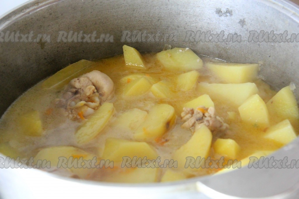 Мясо переложить в казан с зажаркой, картофель нарезать как на жаркое и добавить к мясу, залить все водой и дать закипеть. По вкусу добавить соль и любимые специи, оставить вариться на 15 минут.
