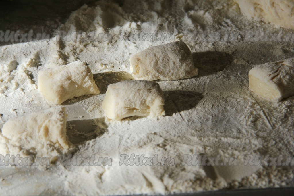 Пока картофель варится, можно заняться тестом для нудлей. Для этого в кефир добавить яйцо и соль. Затем влить растительное масло, соду и добавить постепенно муку. Замесить тесто, оно должно получиться мягким, приятным в работе и не липнуть к рукам. Из теста сформировать жгутики диаметром 1 сантиметр, которые нарезать на кусочки длиной 3 сантиметра.