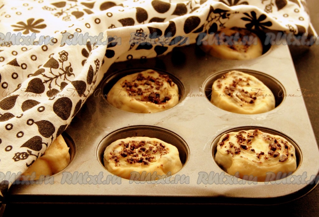 Зазубренным ножом для хлеба аккуратно разрежьте на 12 кусочков и разложите по формочкам для маффинов. Накройте полотенцем и дайте подойти еще около 30 минут.