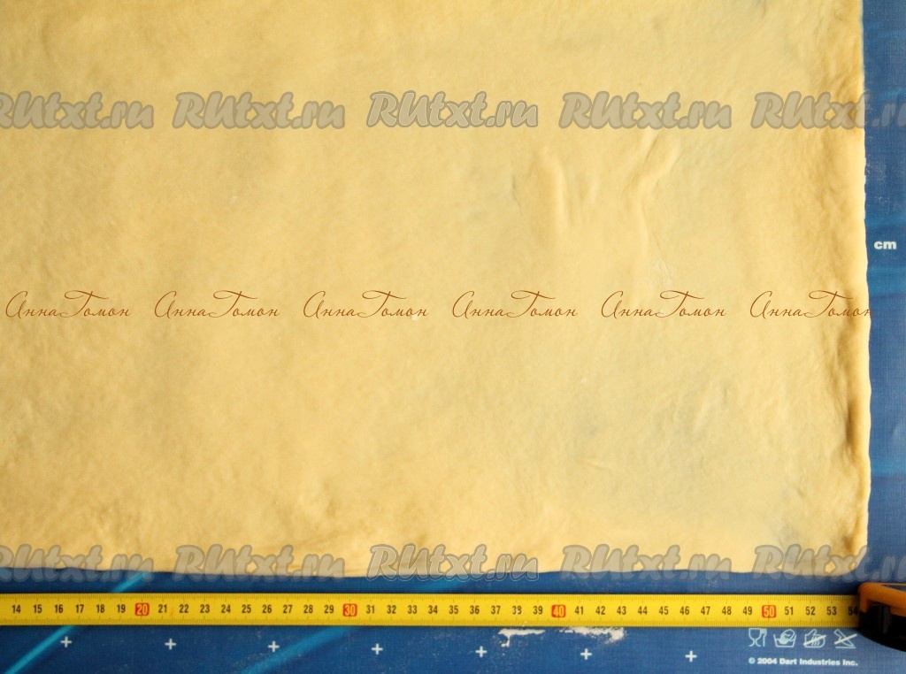 Раскатайте тесто в большой прямоугольник. Короткие стороны должны быть около 30 см, длинные – около 50 см.