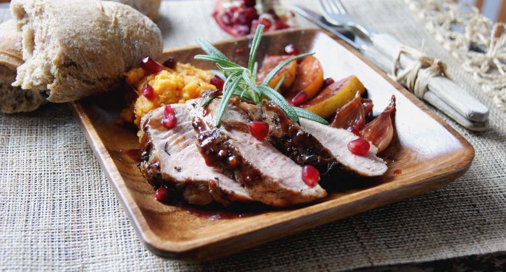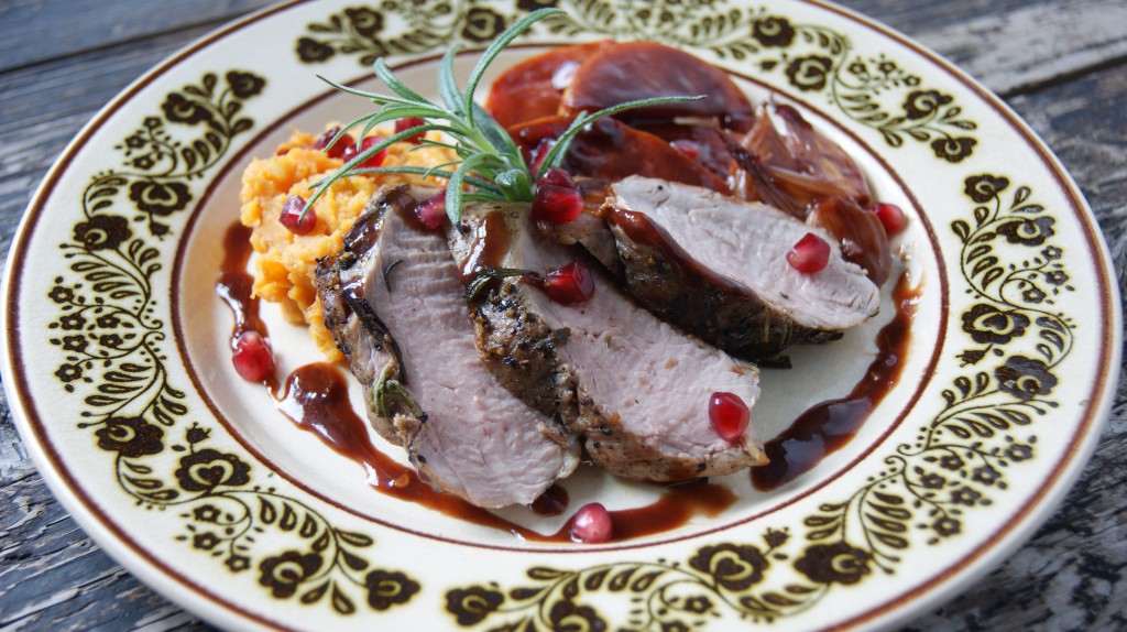 На тарелку кладём кусочки свинины, ложечку пюре, кусочки айвы, лук и поливаем соусом. Украшаем веточкой розмарина и зёрнами граната. Приятного аппетита.