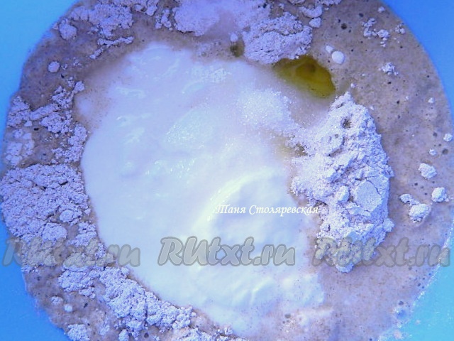 Йогурт должен быть комнатной температуры. Дрожжи растворяем в теплой воде и хорошо перемешиваем.