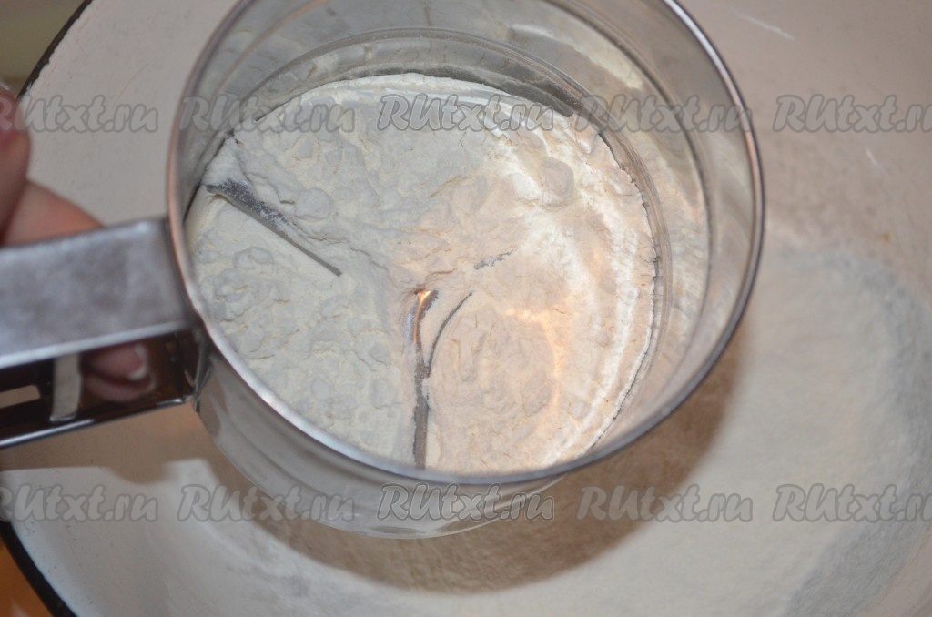 В отдельной миске просеять муку, смешать ее с разрыхлителем.