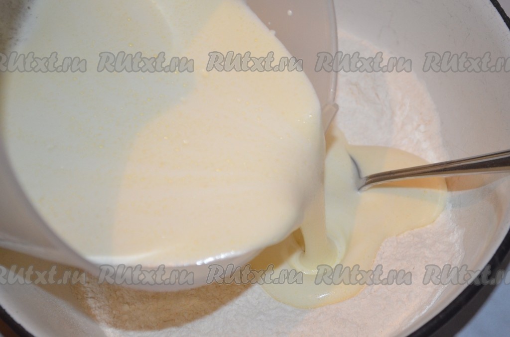 Соединить муку с яичной смесью, тщательно перемешать.