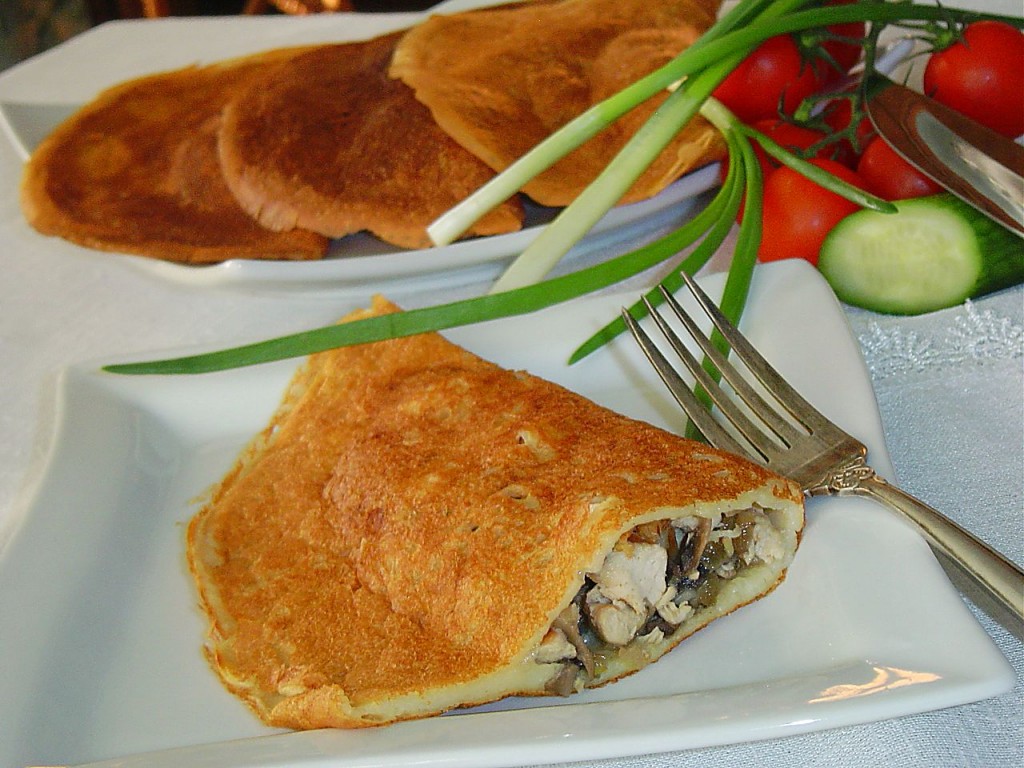 Ну, вот и все! Блинчатые пирожки с начинкой из курицы и грибов готовы!